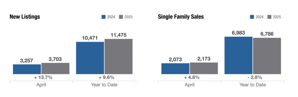 The Columbus real estate market is heating up this spring, with 45% more homes available compared to last April—giving buyers plenty more options to choose from. Home sales are up nearly 4%, and while prices have barely budged (median price sits at $320,000), homes are taking a bit longer to sell at 32 days on average. Sellers are clearly feeling confident, with over 3,700 new listings hitting the market in April alone. Even with all these new listings, it’s still a competitive market—there’s only about a 1.8-month supply of homes, meaning inventory would be gone in less than two months if no new homes came on the market.