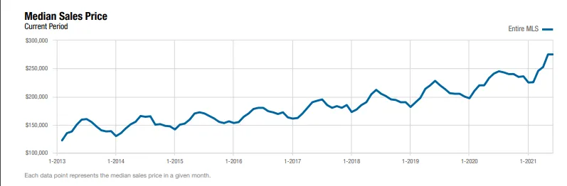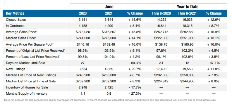 The average price of a home sold in June was $316,207, an increase of 15.8 percent from a year ago. The median sale price was $275,000, an increase of 14,1 percent over June 2020.