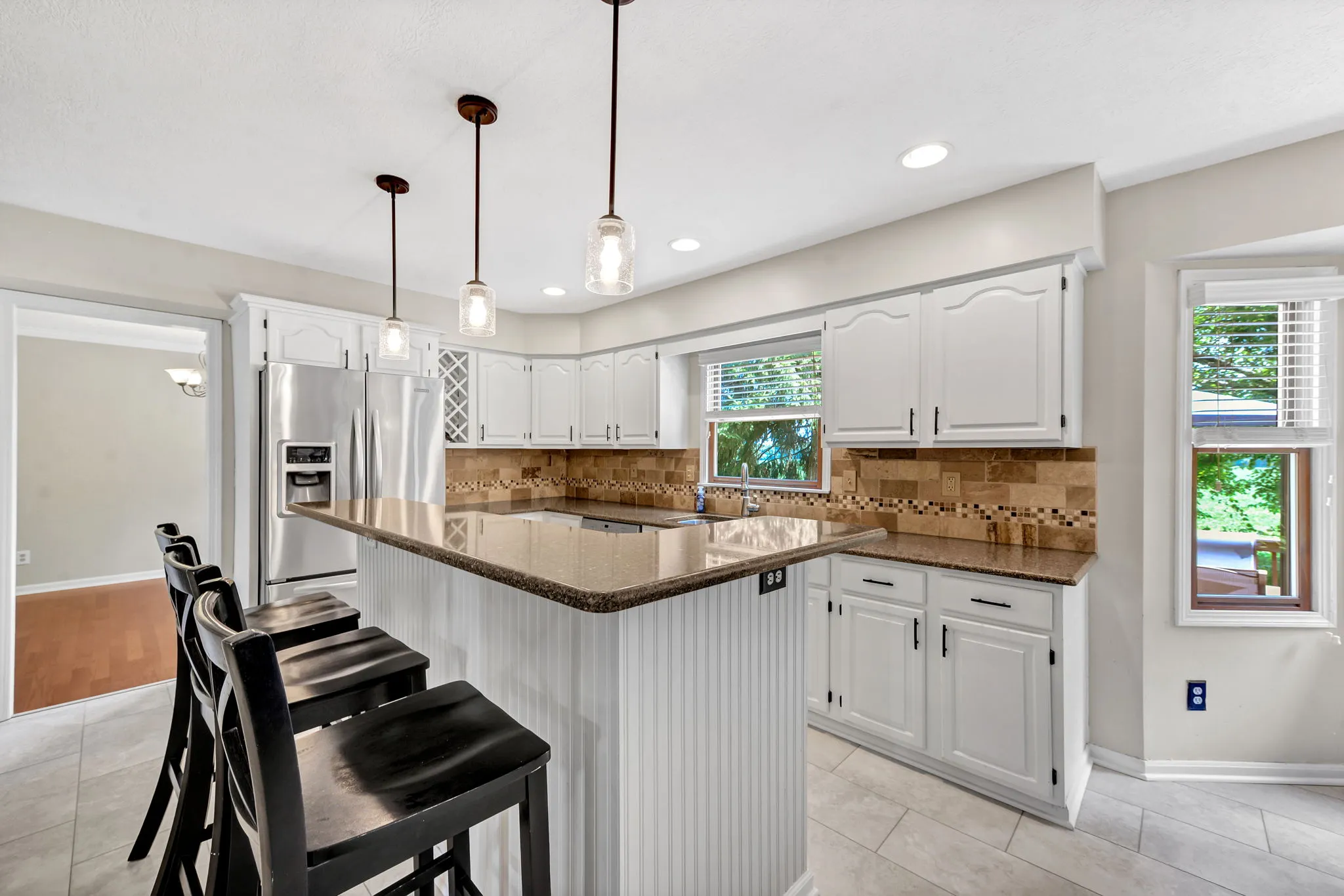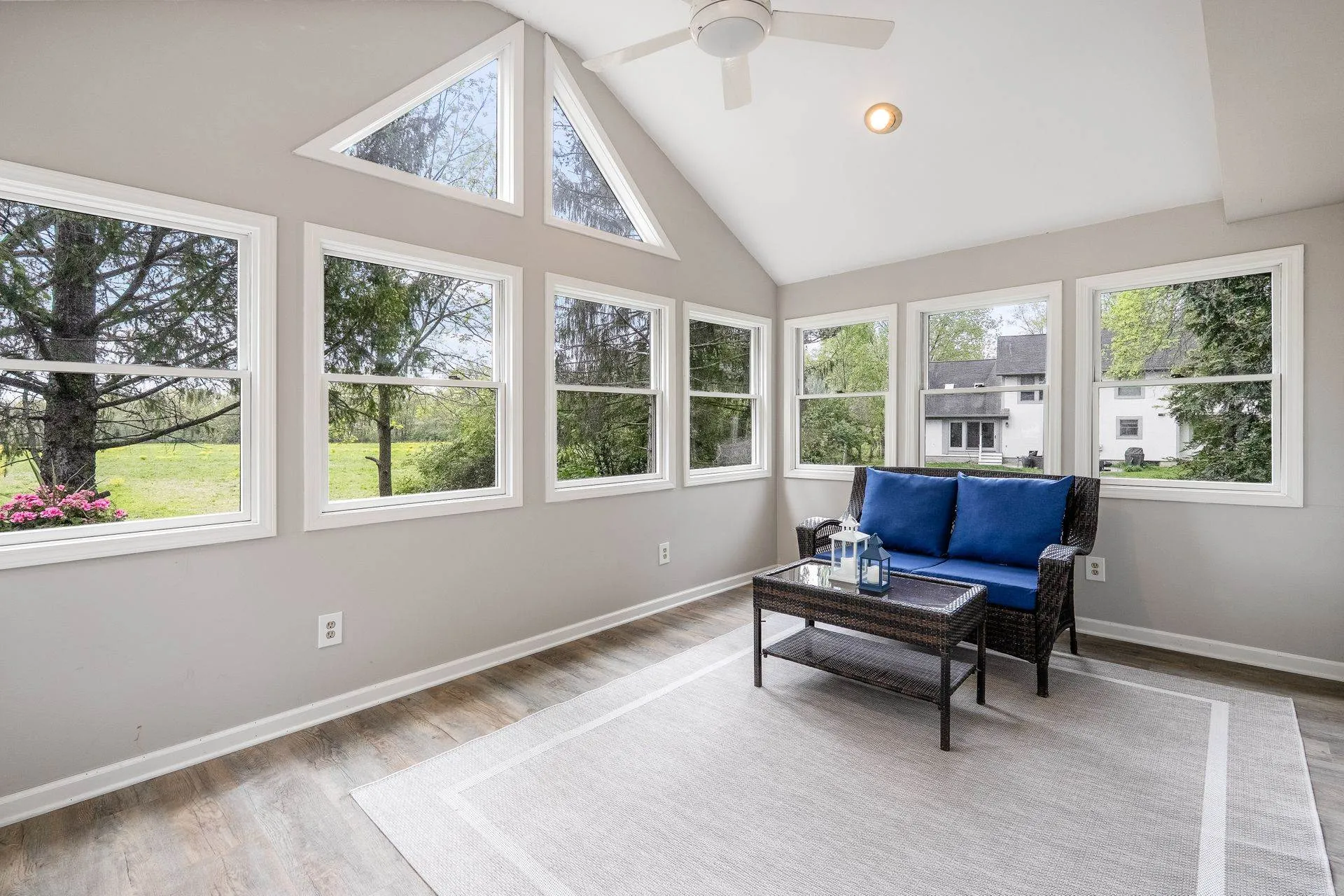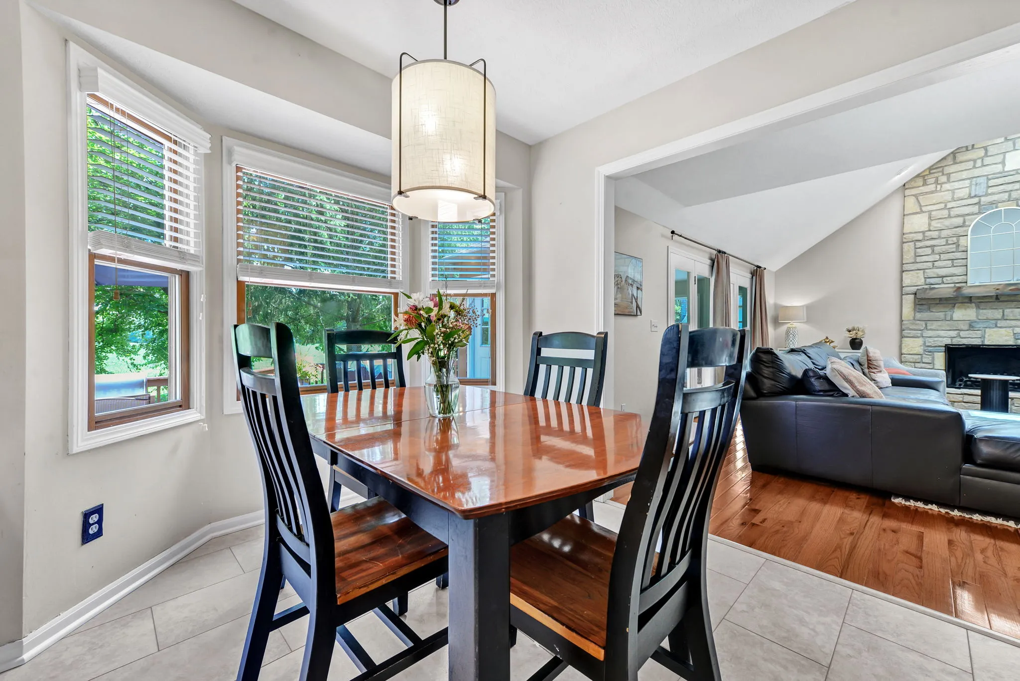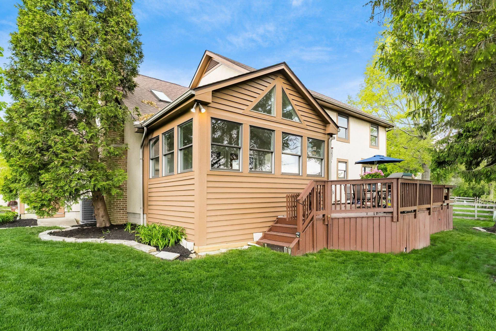 Enjoy relaxing in the charming three-season room or grilling on the back deck with scenic views. The first floor includes a private home office, laundry room, and a large open great room with vaulted ceilings, cozy fireplace, and abundant natural light. Hardwood floors flow through the living and dining rooms, while the kitchen features white cabinetry, quartz countertops, and a sunny breakfast area. Staircase from Great Room leads to second floor loft offering a perfect spot for a second office, reading nook, or computer space. Large Southeast-facing backyard is ideal for outdoor activities. Additional highlights and updates include; a rare three-car garage for this community, Kitchen appliances (2016), exterior paint (2020), deck painted (2024), updated interior paint (2022 and 2024), new carpet (2024), new HVAC system (2024), and a water heater (2023).Â