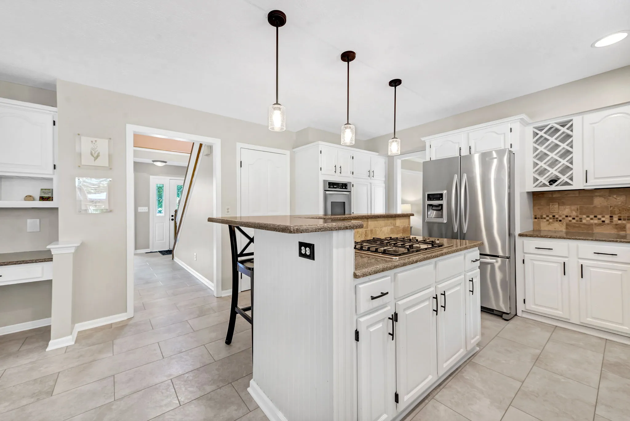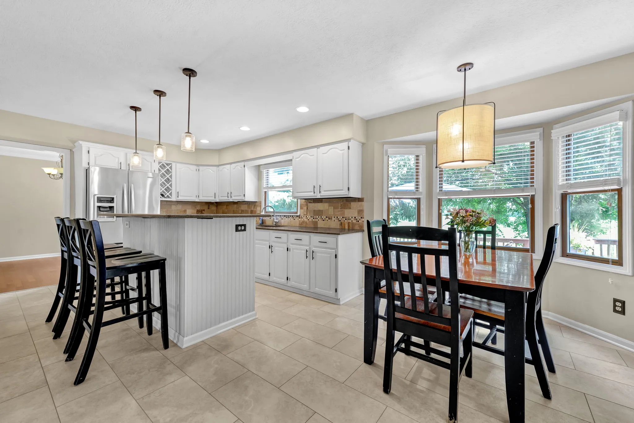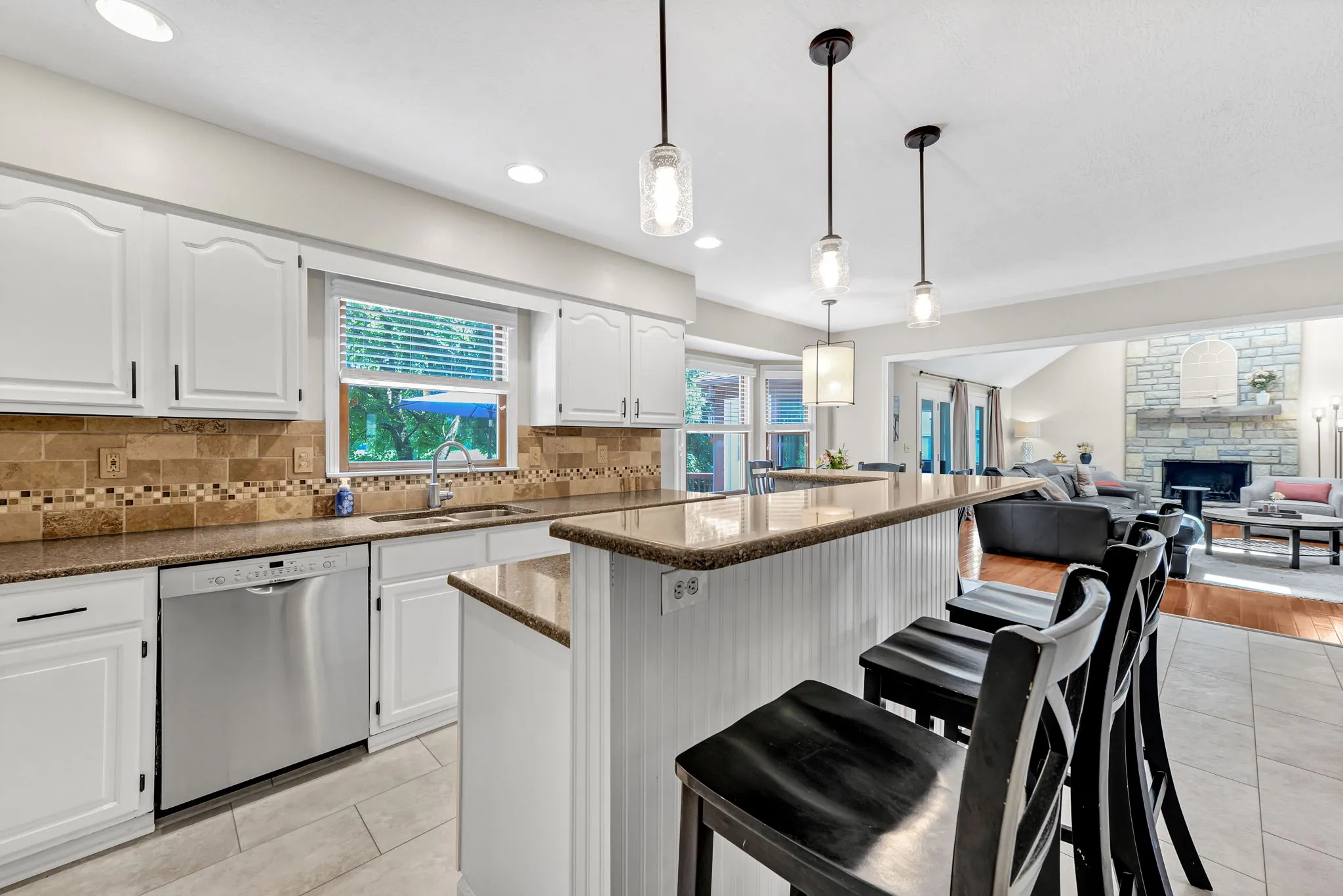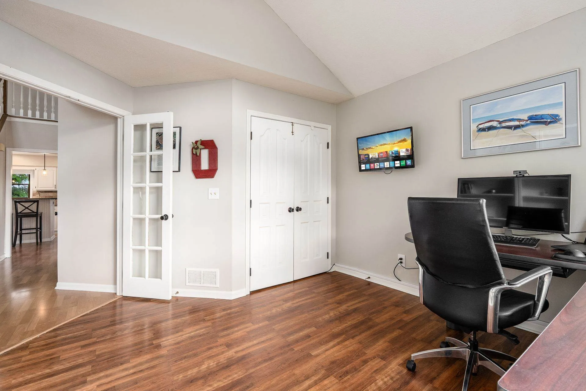 Enjoy relaxing in the charming three-season room or grilling on the back deck with scenic views. The first floor includes a private home office, laundry room, and a large open great room with vaulted ceilings, cozy fireplace, and abundant natural light. Hardwood floors flow through the living and dining rooms, while the kitchen features white cabinetry, quartz countertops, and a sunny breakfast area. Staircase from Great Room leads to second floor loft offering a perfect spot for a second office, reading nook, or computer space. Large Southeast-facing backyard is ideal for outdoor activities. Additional highlights and updates include; a rare three-car garage for this community, Kitchen appliances (2016), exterior paint (2020), deck painted (2024), updated interior paint (2022 and 2024), new carpet (2024), new HVAC system (2024), and a water heater (2023).Â